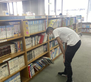 次に2階フロアで、安全な避難方法をクイズに答えながら学びます。逃げるときは腕で鼻と口を押さえ、姿勢を低くして忍者のような体勢で、と見本を見せるとみんな少し笑っていましたが、理由を説明すると「そうなんや」と納得。