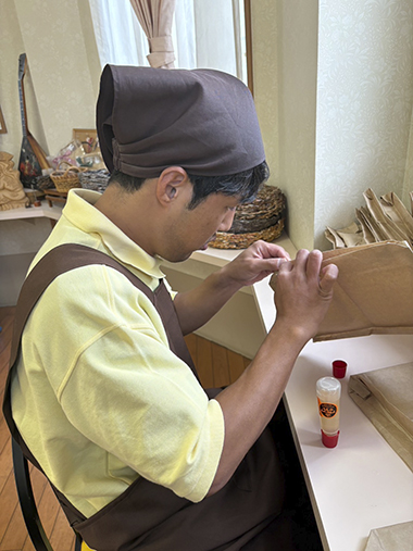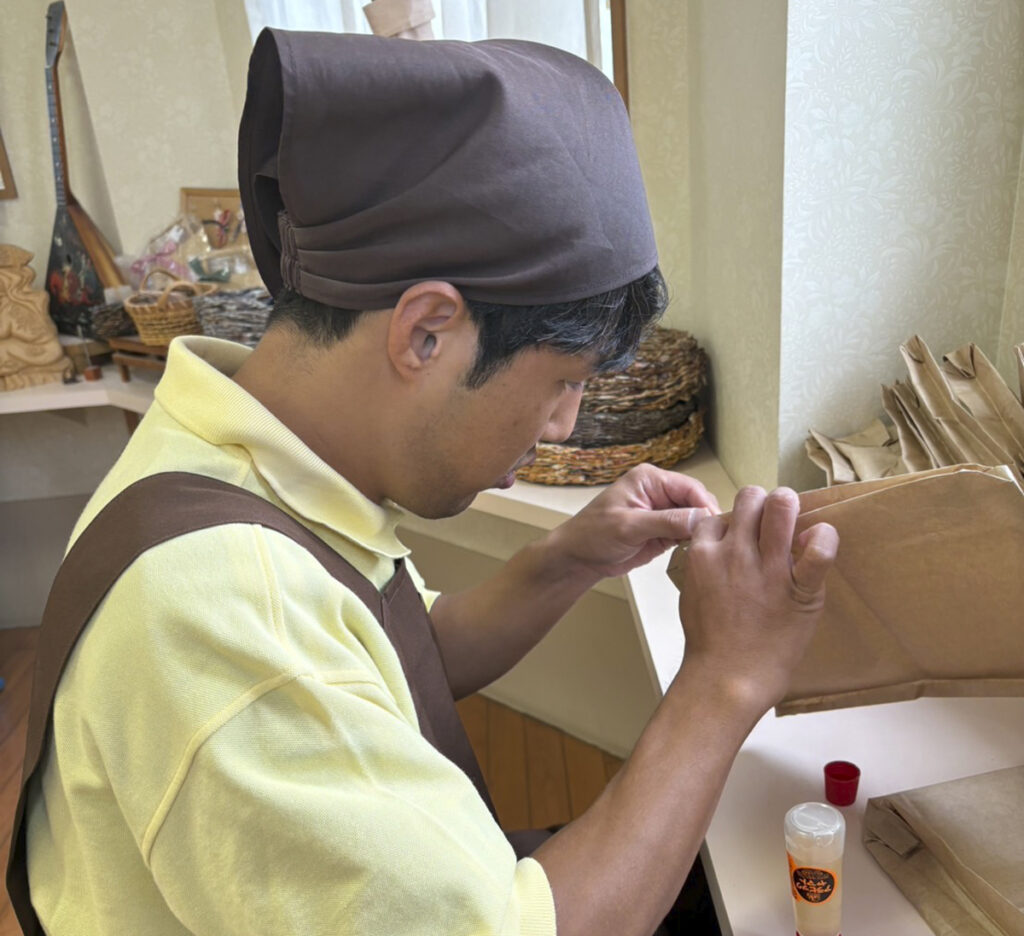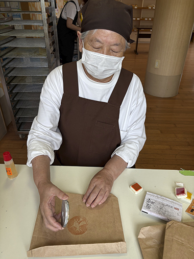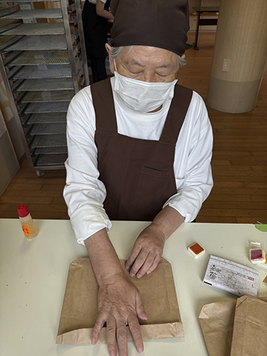 難しい作業箇所もありますが「これでええかなぁ」「細かく折るの難しいわ!」と言いながらもみんなで協力して頑張っています。お客さんから「カワイイ!」「家で野菜を入れるのにちょうどいいのよ~」という声をいただき、やりがいを感じています。