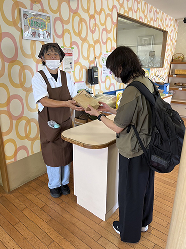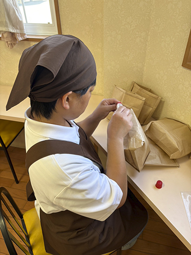 「マジックブルーム」では購入していただいたパンを入れる袋を手作りしています。ナチュラルな風合いで皆さんに好評です。
