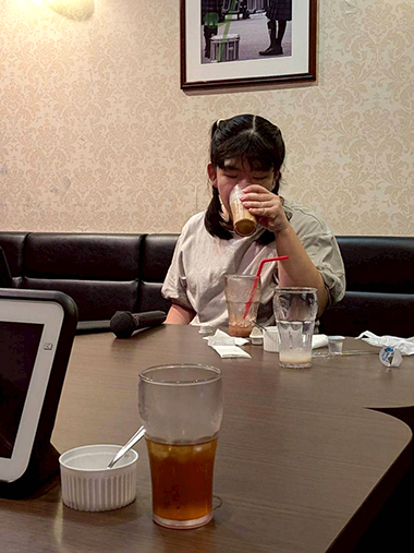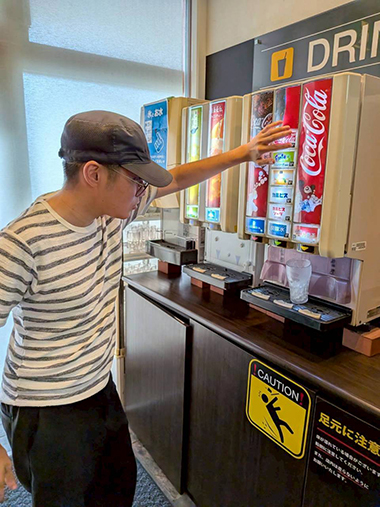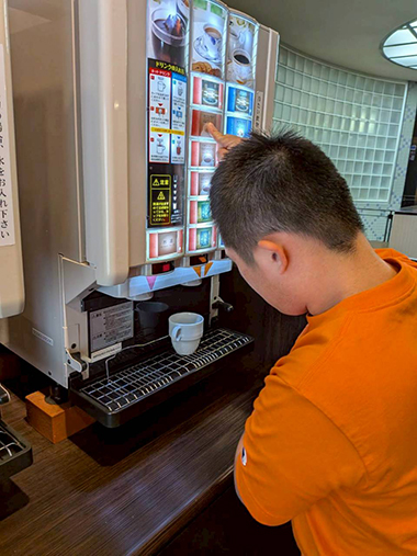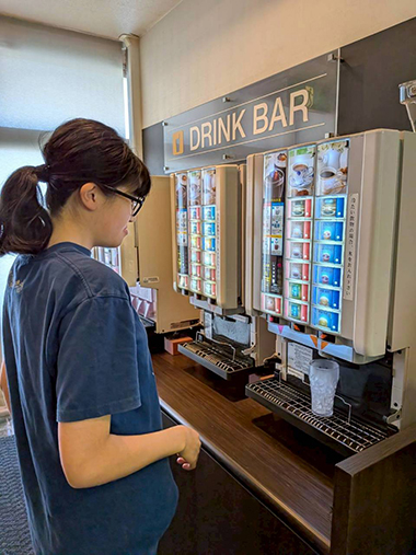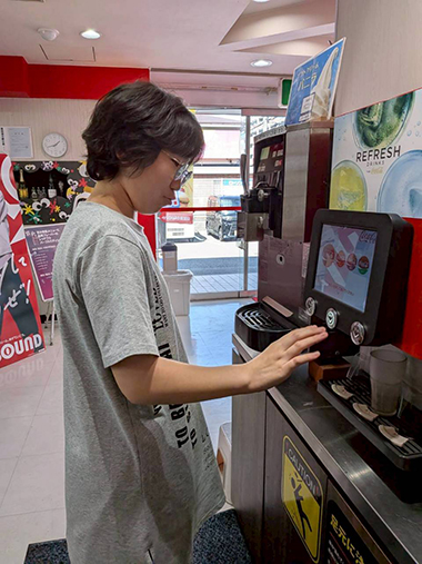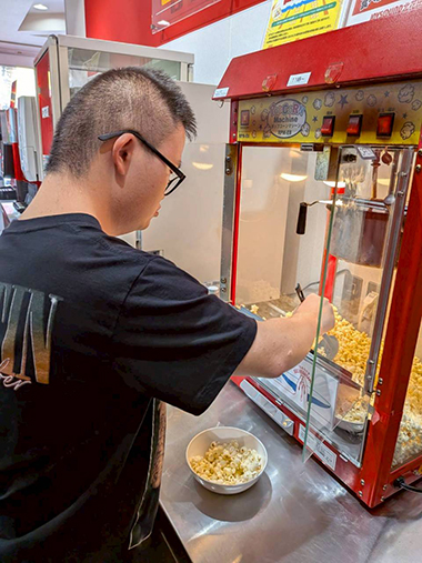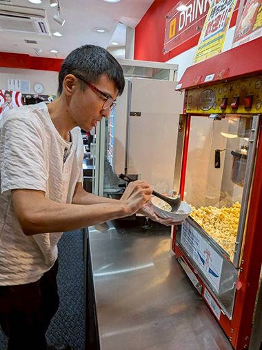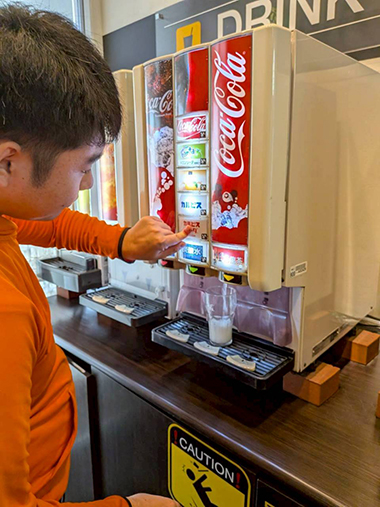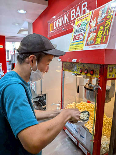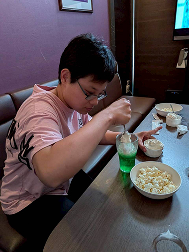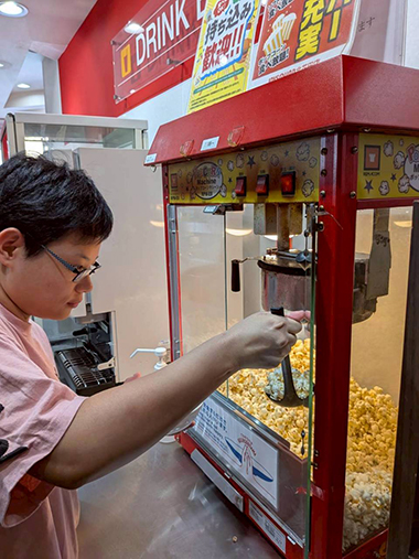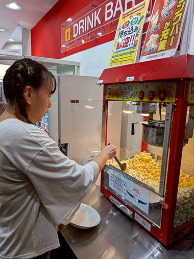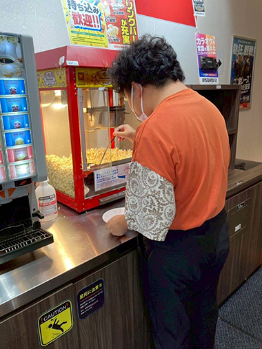 ポップコーンやソフトクリーム食べ放題、ドリンク飲み放題ということで、昼ご飯は控えめにして出発しました。グループに分かれて各部屋に入ります。ソフトクリームの機械はみんな初挑戦! ドキドキしながらカップに入れます。不安そうな人は支援員がサポートしました。クリームソーダを作る人もいます。