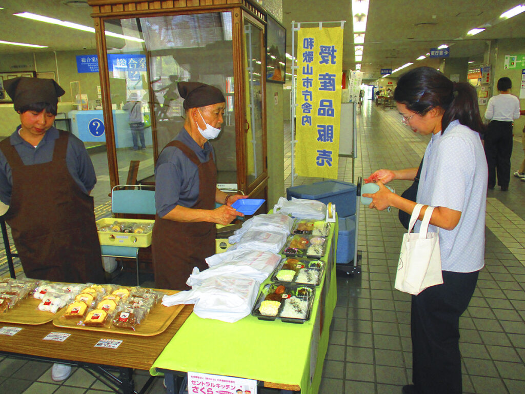 「セントラルキッチンさくら」では、和歌山市役所で開催される授産品販売に年3回参加しています。今回は当日の朝に作った唐揚げ弁当とハンバーグ弁当、「マシュウおじさん」の焼き菓子を持って出発しました。