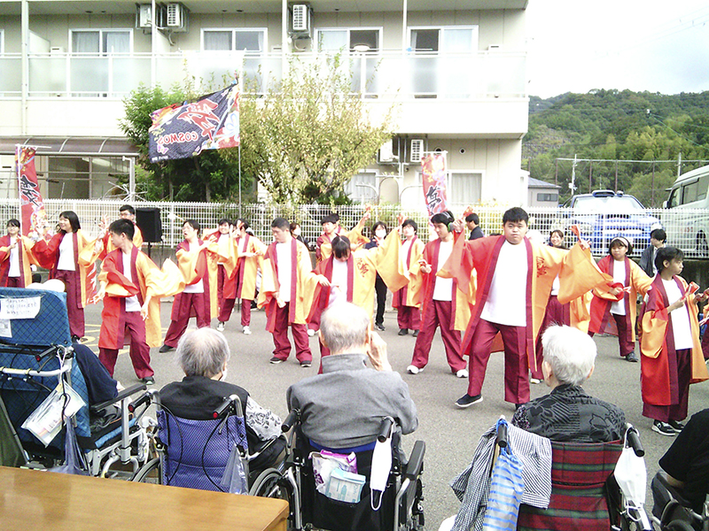 午前10時、当日の説明と挨拶が終わり、いよいよ始まりです。トップバッターは紀伊コスモス支援学校高等部の生徒による「よさこい」の演舞です。元気いっぱいに身体を動かして躍動感あふれ、見応えがありました。「息がぴったり」「元気いっぱいね」と皆さんからも笑みがこぼれます。続いて、県議会議員の片桐さんと市議会議員の吉本さんから来賓挨拶がありました。
