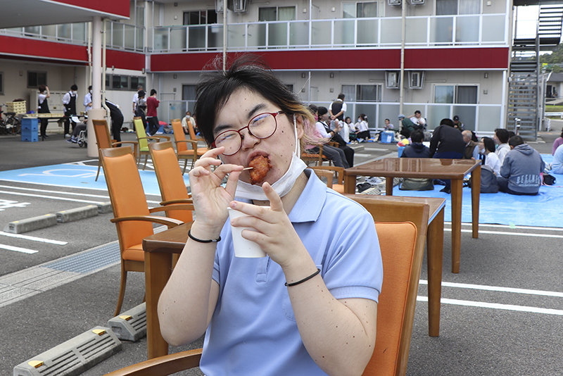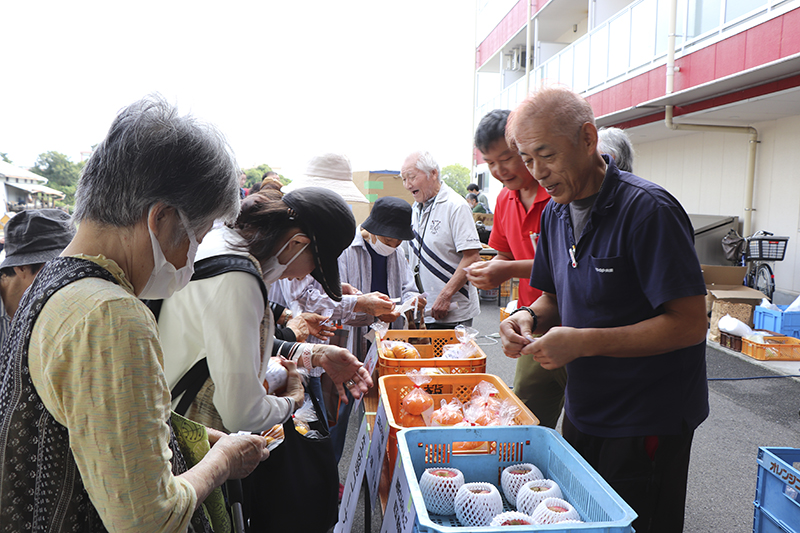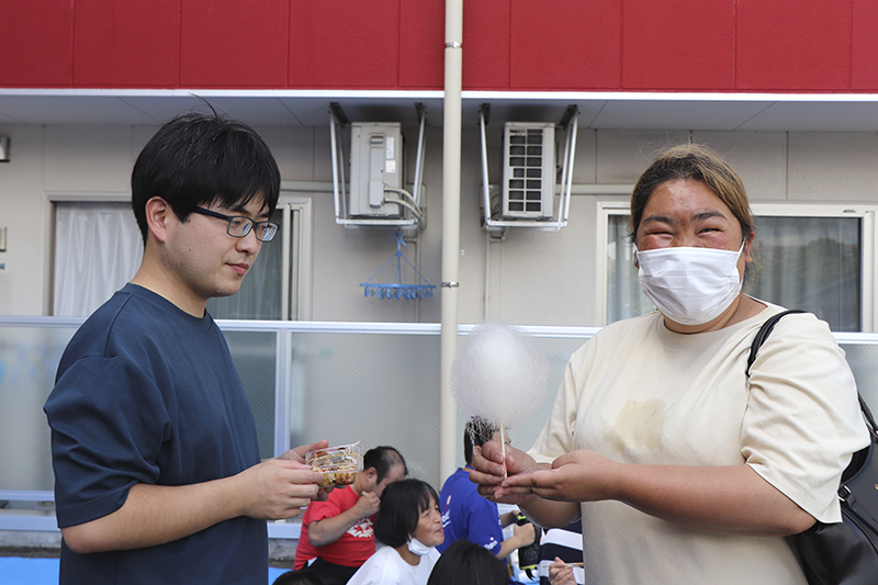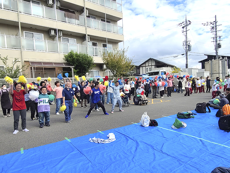 10月20日に「おひさま東」で、「みのり紀伊」「おひさま」「おひさま東」と「野のはな」合同の秋祭りを開催しました。入居者に声を掛けると「今まで行ったことがなかったけど、一度行ってみましょうか」「たこ焼き食べたいから案内して」などのうれしい返事。