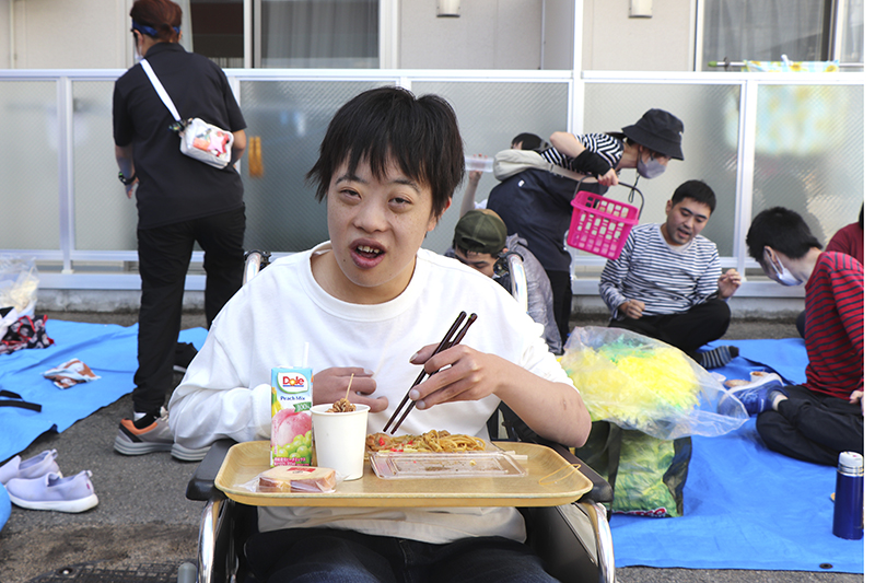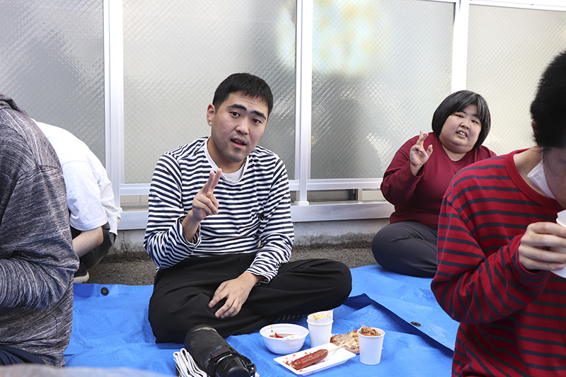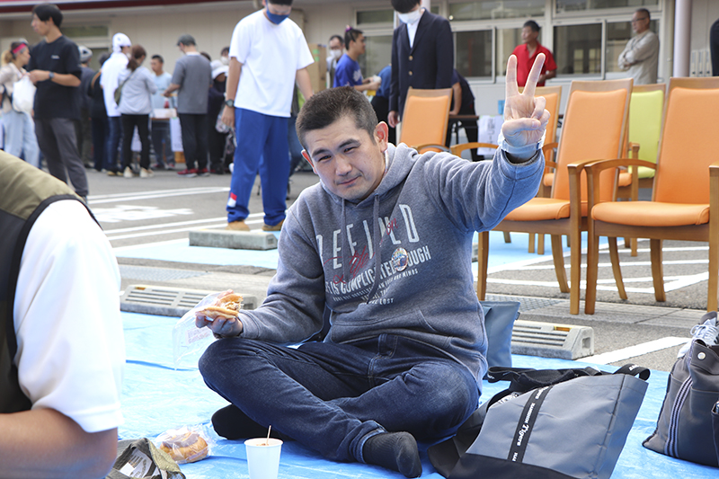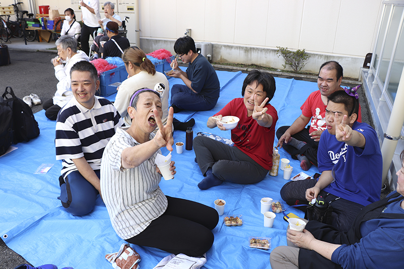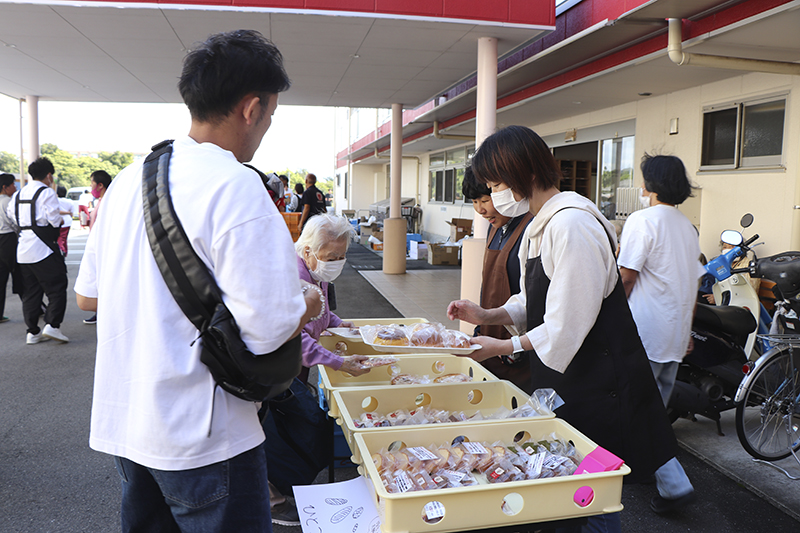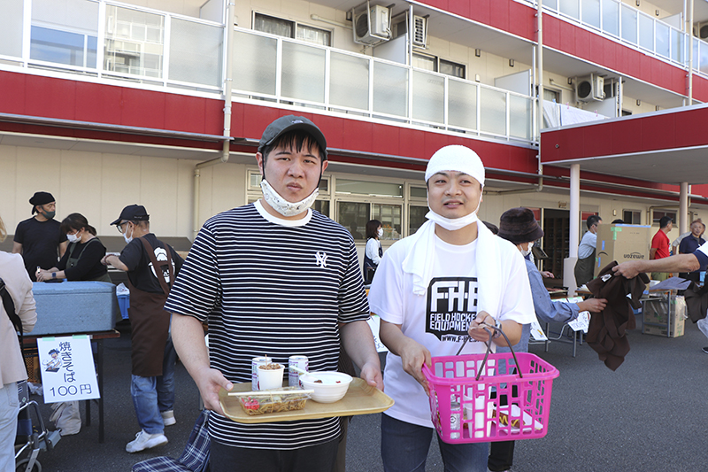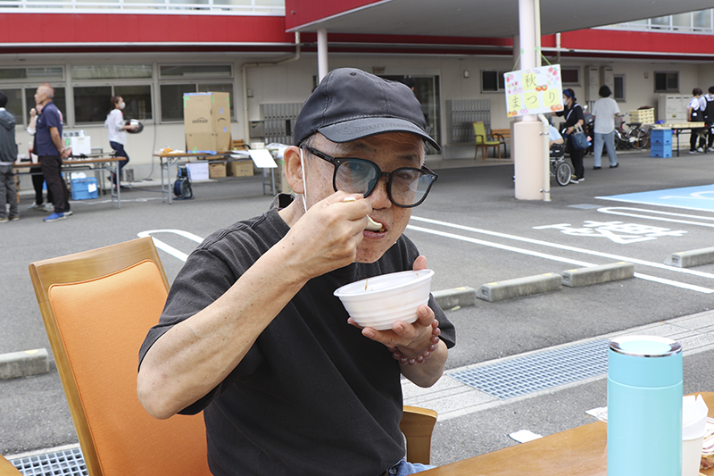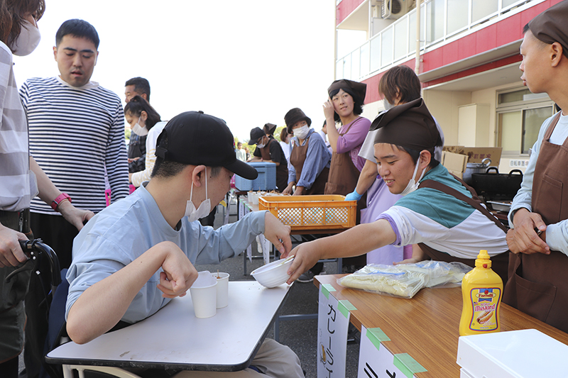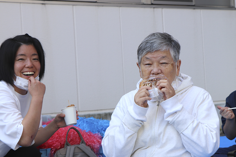 催しが終わると模擬店での買い物。「たこ焼きは二つ欲しい」「パンも食べてみたい」と皆さん目を輝かせながら順番を待っておられます。「出来立てでおいしい」と好評でした。