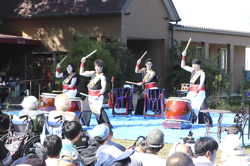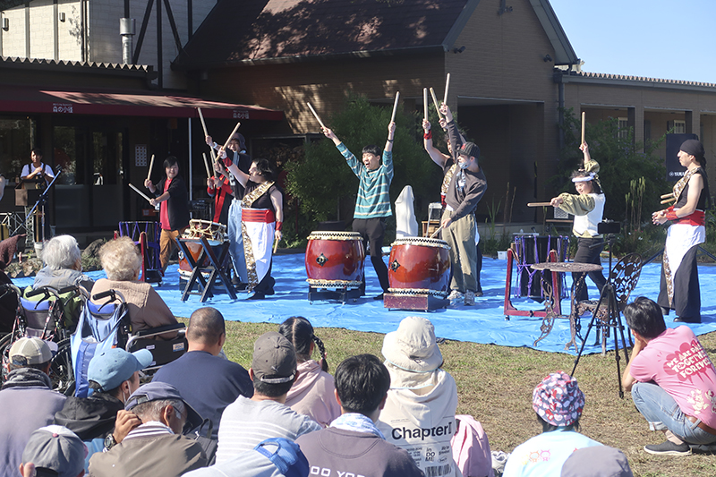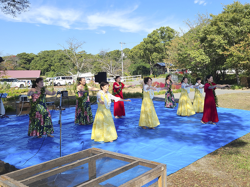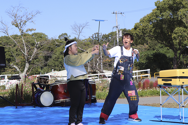 「紀州和太鼓集団いこら」による演奏でスタート。素晴らしいバチさばきで迫力満点。続いて、子どもに大人気のパフォーマー「まつだこうき」さんのジャグリングとマジックです。観客とのコミカルなやり取りに笑いがあふれます。高く投げたリンゴを一口かじりながら繰り広げられるジャグリングに「すごい」と声が上がりました。次の演目は「フラダンス」。ゆっくりとした動きとウクレレの音色がまるで南国にいるかのようです。