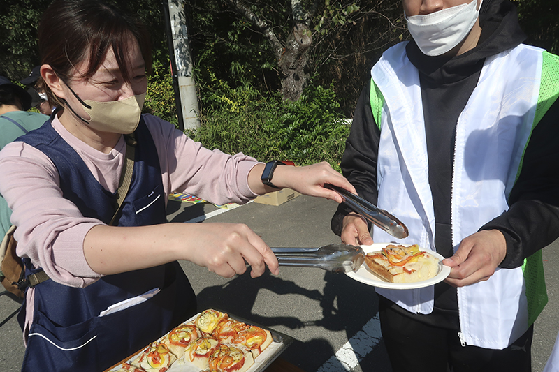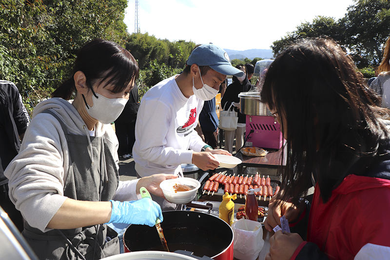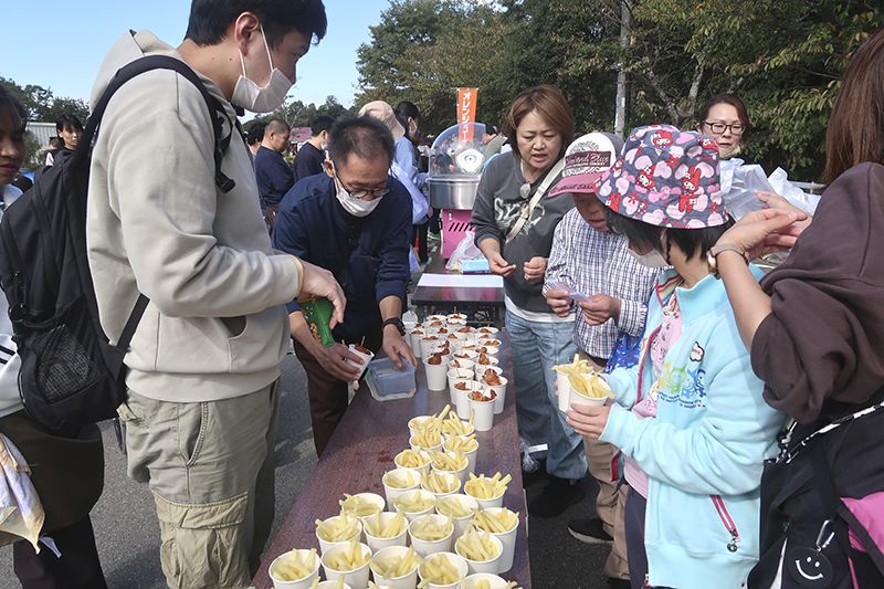 あっという間に昼になり、恒例の模擬店です。たこ焼きや焼きそば、カレー、から揚げ、ポテト、フランクフルト、綿菓子、カットピザなどを販売。次々に売れて完売です。その場の雰囲気を楽しみながら出来立てを外で食べると特別おいしく感じます。