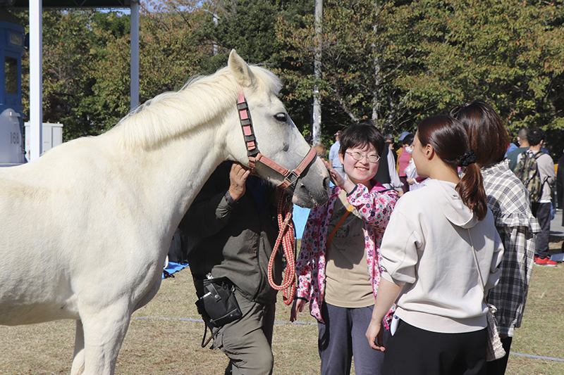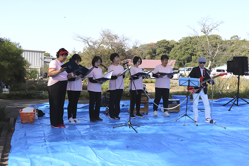 おなかがいっぱいになったところで「みのり阪南」の入居者による軽快なギター演奏が始まりました。コーラスグループ「いとはん」が音楽に合わせて「ダンシングヒーロー」などを振り付きで歌い、盛り上げます。最後は馬との触れ合いで癒されました。