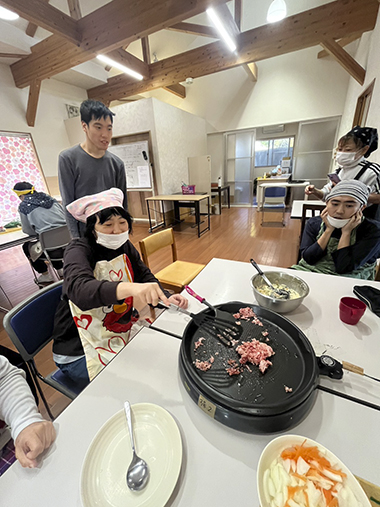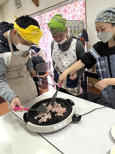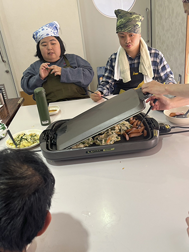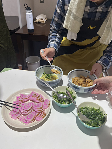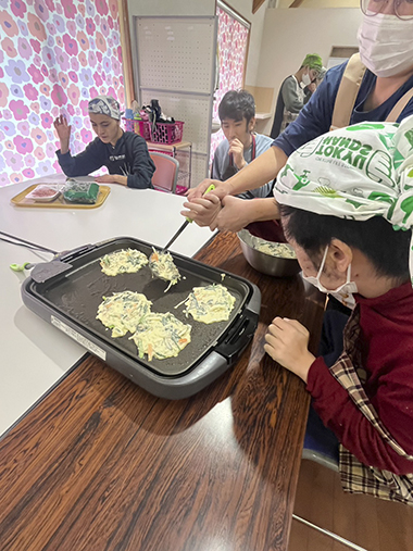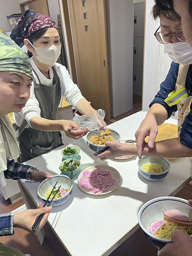 チヂミは小麦粉に水や具材を入れて混ぜ合わせます。みんなで交代しながらこぼさずに上手に混ぜることができました。その生地をホットプレートで焼いて、焼けた順に食べます。「おいしい、おいしい」と一人で何枚もおかわりをする人もいました。ラーメンは、丼に支援員が麺を入れておき、各自ハムなどを盛り合わせます。