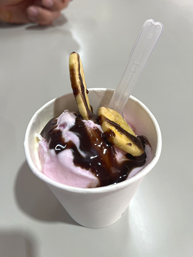 最後は、みんなで食器を片づけてデザートのパフェ作り。紙コップにそれぞれコーンフレークやカステラを入れてアイスクリームをのせ、チョコシロップをかけて完成です。全員、キレイにトッピングできました。