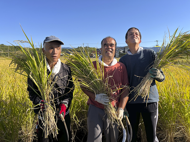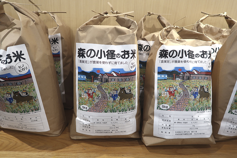 農薬を使わずに育てました。米袋のラベルは「野のはな」利用者の井上陽太さんの作品です