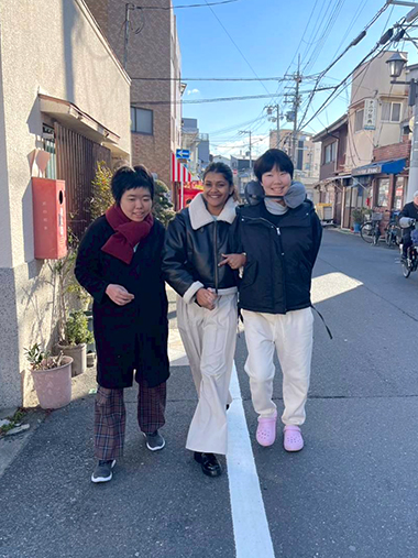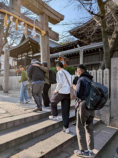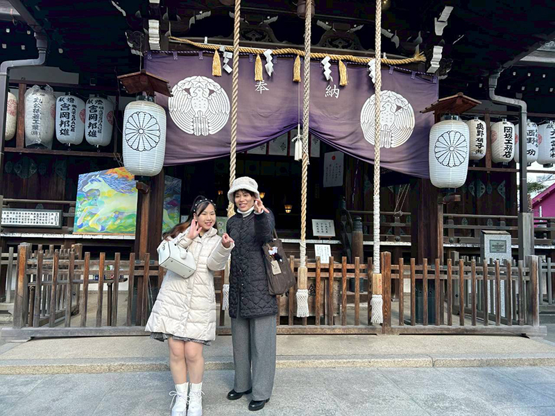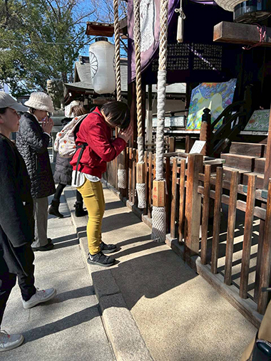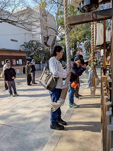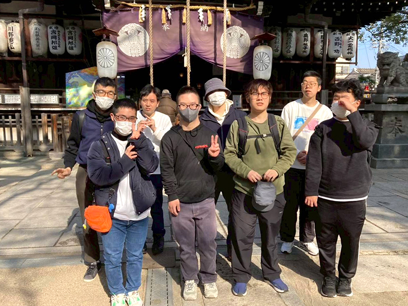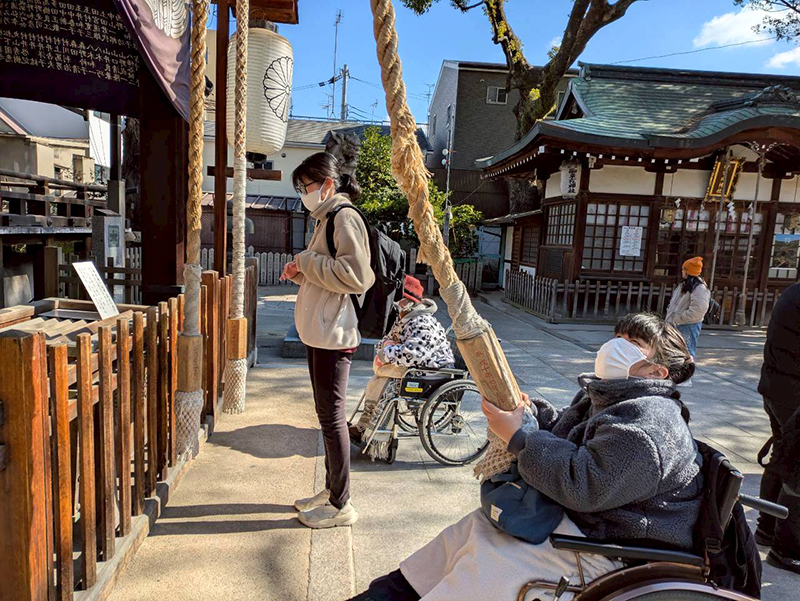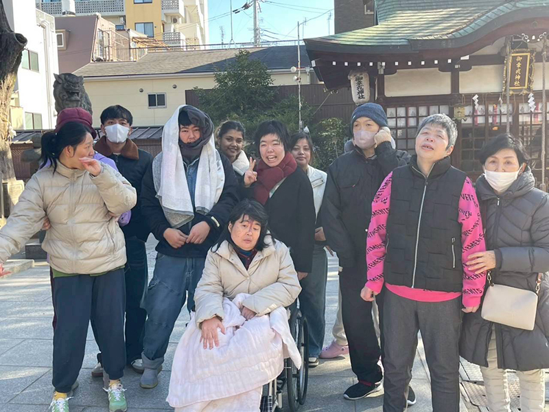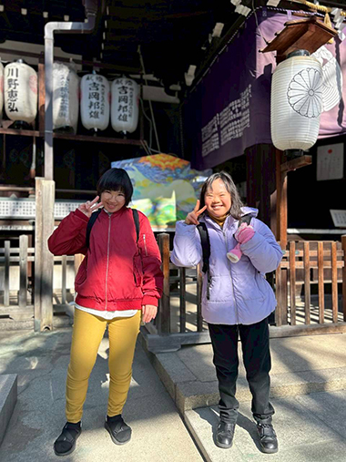 「障碍者支援事業所野のはな」では、1月16日と23日に分かれて御幸森天神宮へ初詣に行きました。境内に入ってお賽銭を納め、手を合わせて願い事をします。願い事が多すぎてなかなか終わりません。記念撮影をして神社を後にしました。