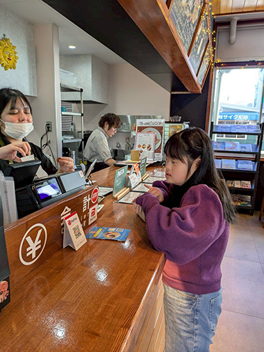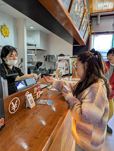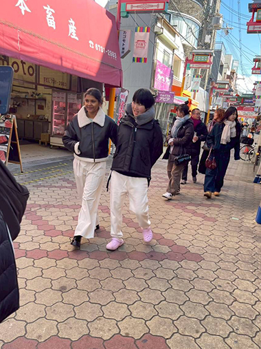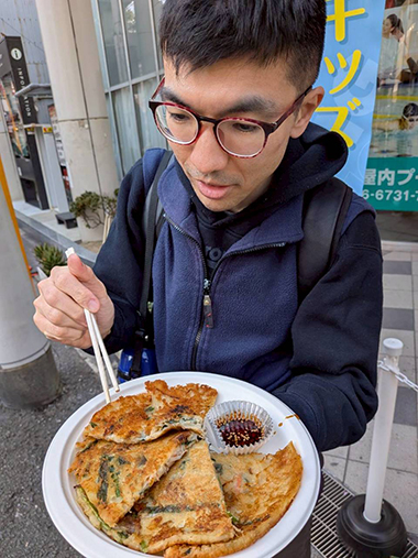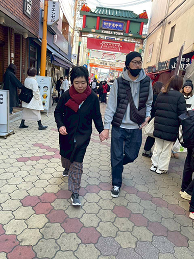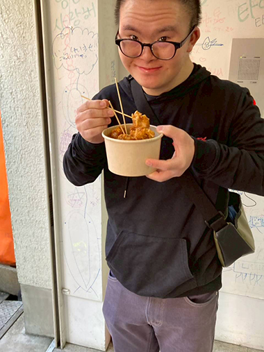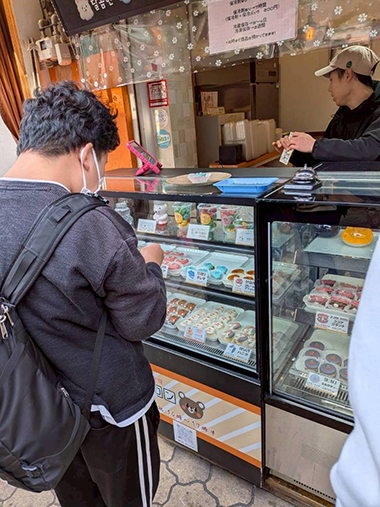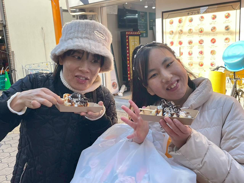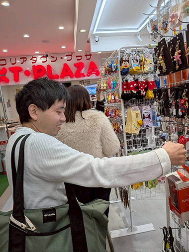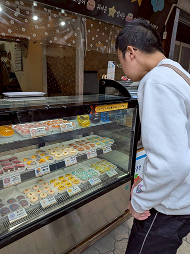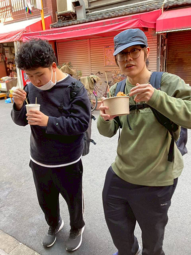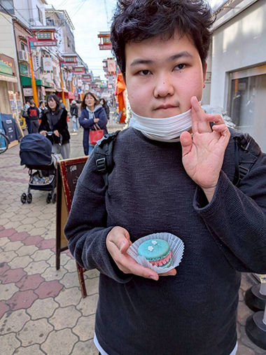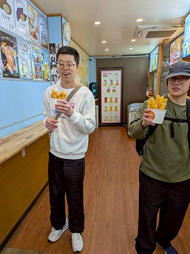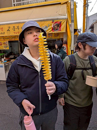 続いて、コリアタウンで買い物です。コスメやアクセサリー、KPOPアイドルのショップ、キムチやチヂミの店などで好きな物を思い思いに買いました。30センチもあるトルネードポテトを頬張り満面の笑み! 唐揚げやマカロン、ドリンクなどなど。それぞれに満足したようです。