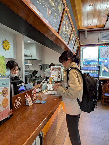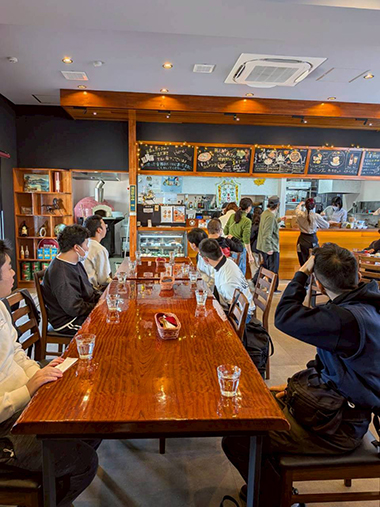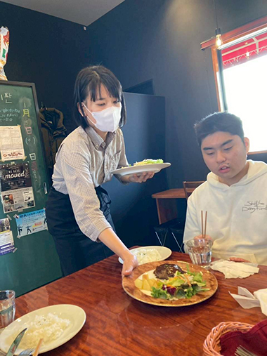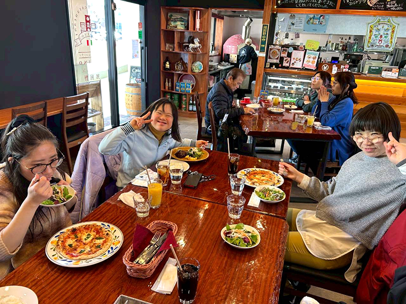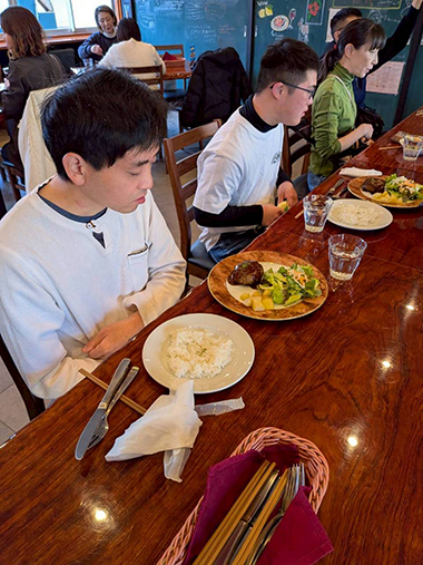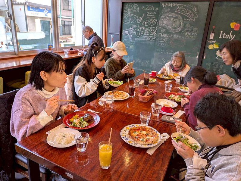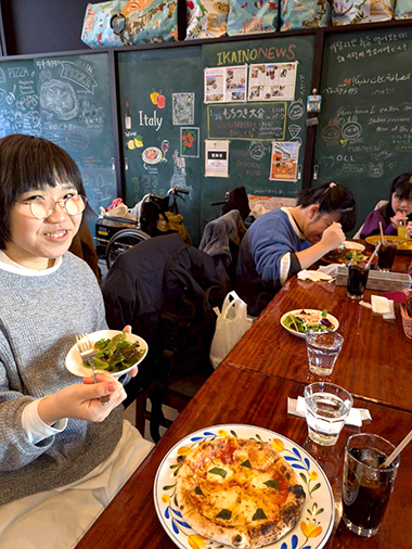 その後、レストラン「猪飼野」で食事です。石窯で焼いたピザは最高! 手ごねハンバーグも格別です。みんな「おいしー」と堪能していました。