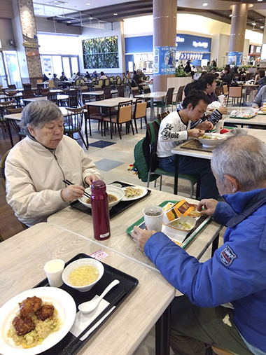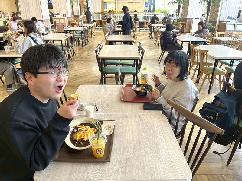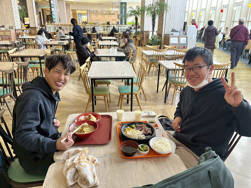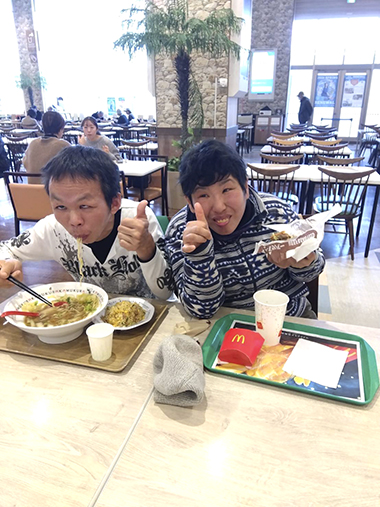 走り疲れた後は、泉南イオンでお楽しみの昼食です。フードコートで「何を食べようかな?」と悩みながら、それぞれ自分で購入しました。運動した後なので食事だけでは物足りずにデザートを食べる人もいます。食後はゲームセンターやショッピングを楽しみ、あっという間に帰る時間になりました。