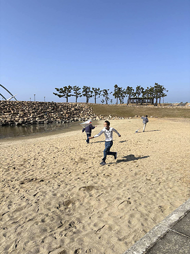 風が弱いのでたくさん走ります。時々風が吹いてたこが揚がると、「揚がった!」「すごい! すごい!」と大歓声。笑顔があふれます。