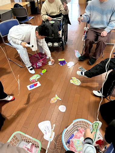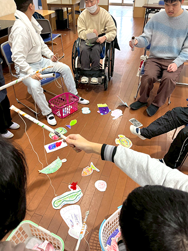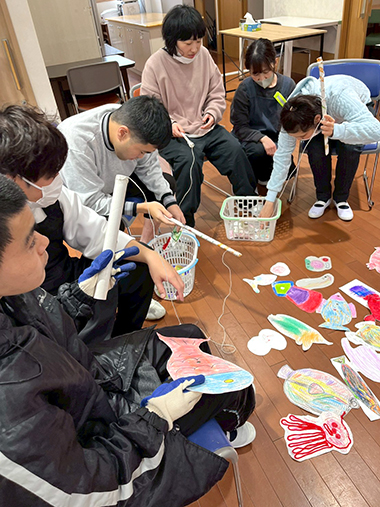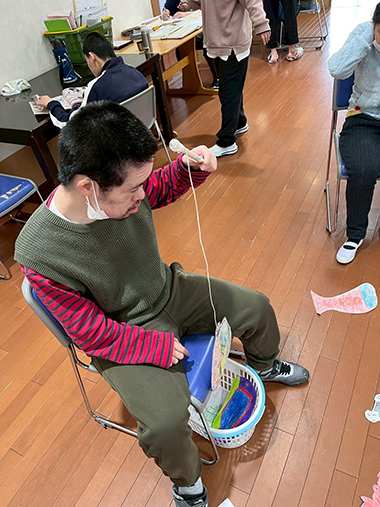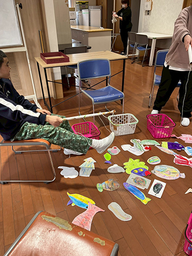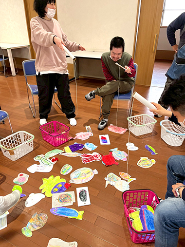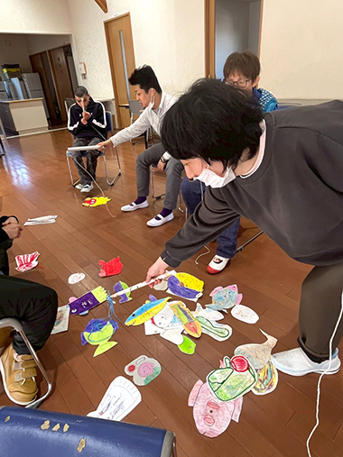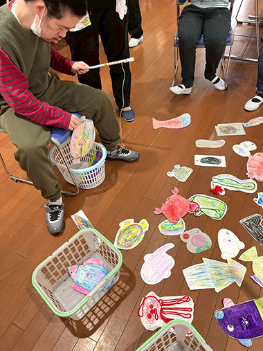 「これAさんが作ったやつや」「きれいな色の魚やな」などと言いながらうれしそうです。じっと座ることが苦手な利用者もこの日はとても喜んで集中しているようです。