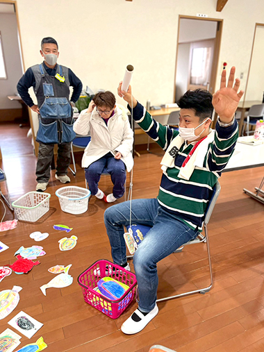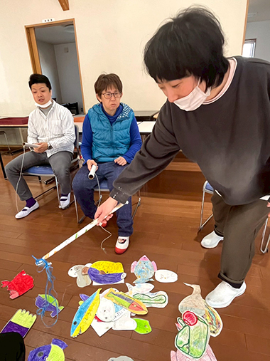 この日は椅子に座って魚釣りゲームをしました。魚や貝は、自分たちで画用紙に描いて色を塗り、切り抜いて作りました。釣竿はサランラップの芯にたこ糸を付けた物。全て手作りです。みんな椅子にじっと座ってお目当ての魚を釣るのに真剣です。