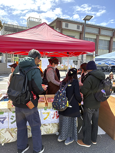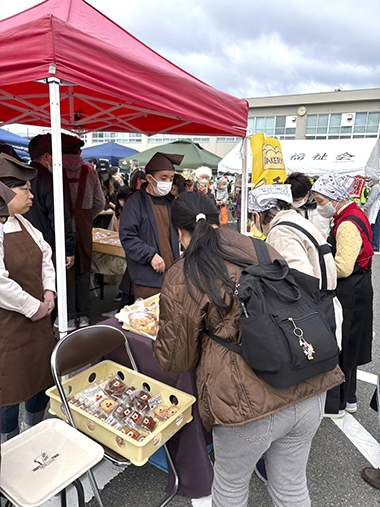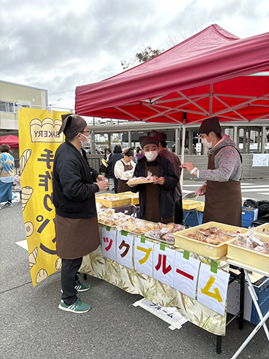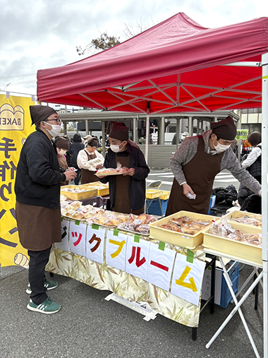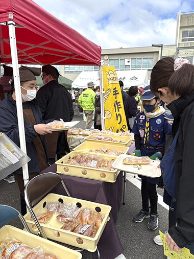 「手作りパン」と書かれたのぼりを新調して「いらっしゃいませ!」「パンはいかがですか!」とみんなで元気よく販売します。用意した150個はなんと1時間ほどで完売!